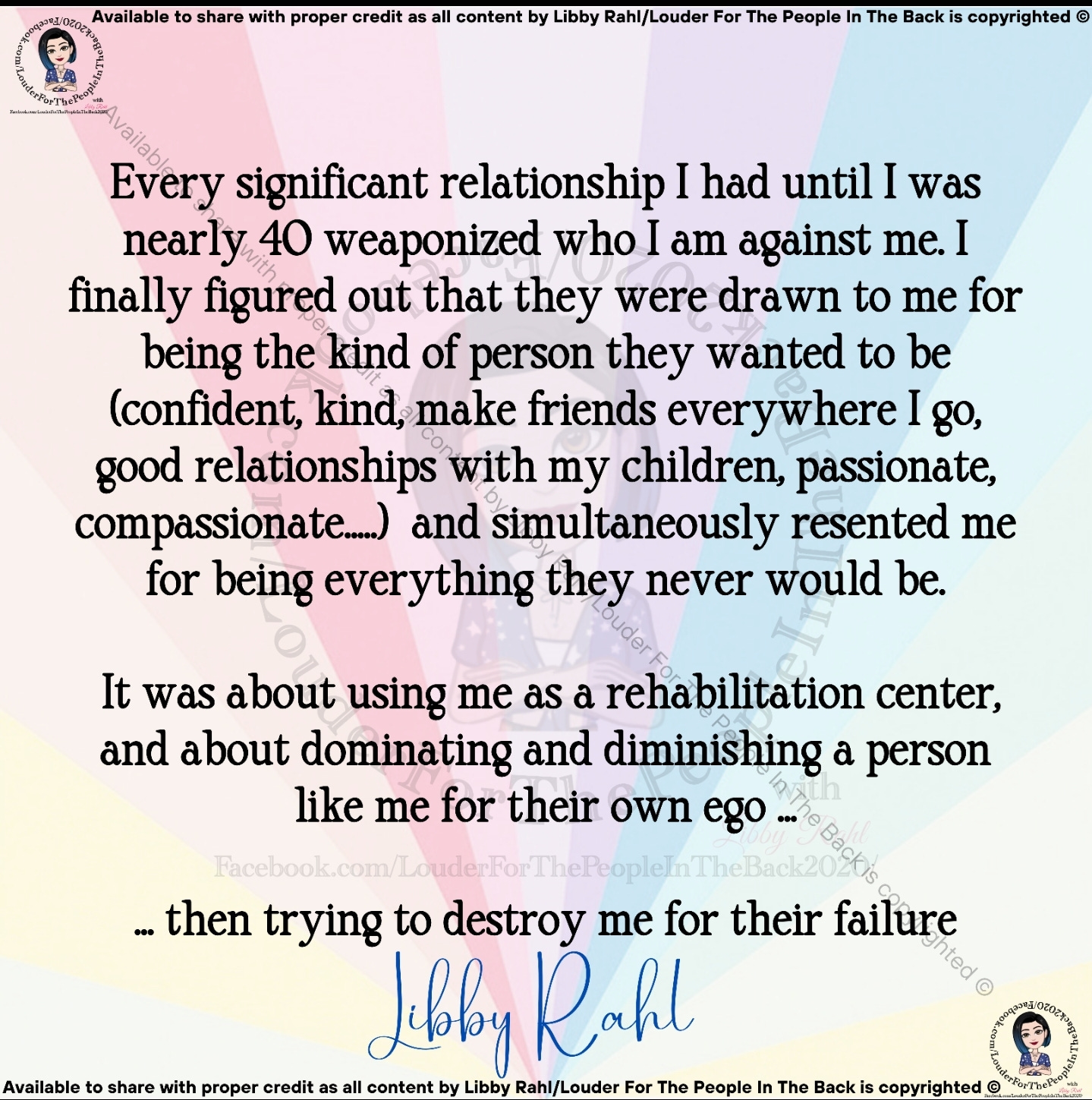and then he slowly tore me down. he was so sneaky. so subtle. over the years he has perfected his MO (I was the latest in a long line of confident women he targeted when vulnerable and then tore down). he hurt me in every way ... but he never hit me. but he hurt my daughter, too. he used everything against me. used my child against me. he tried to destroy everything I am. and it almost worked. (previously posted here Gaslighting: Destroying you from the inside)