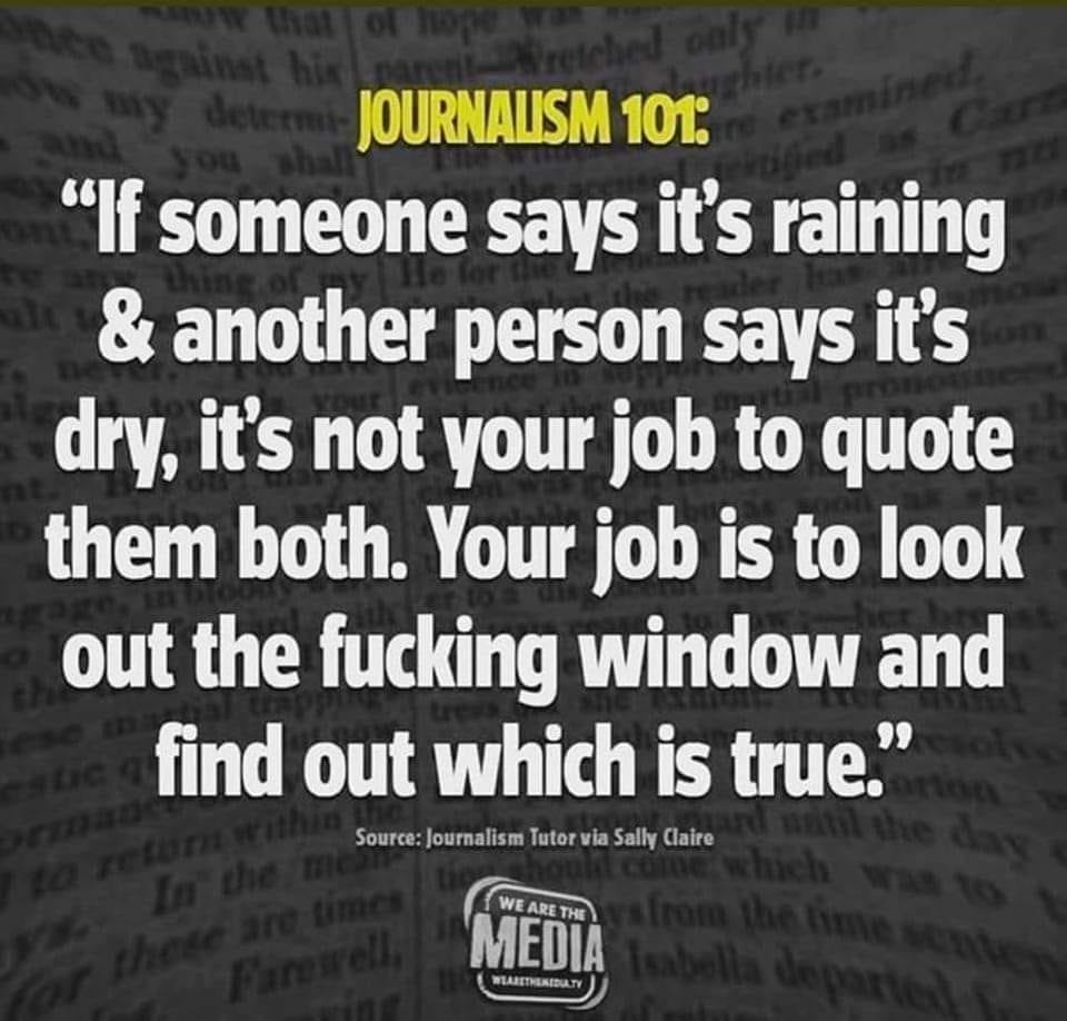 I'm done with "news" being "newest propaganda". I feel like from here on out, if a journalist or news publication or whatever does not fairly show both sides, they can no longer be called news and be relied upon as much as we do a 4chan quanon blog. If they cannot show verified unbiased information, they are not news, they are propaganda machine. And should be treated as such. They should not have the same protections as legitimate news